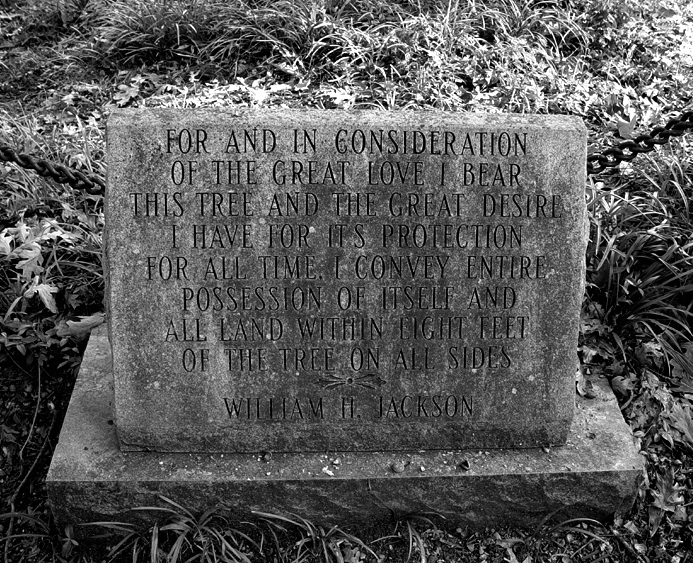The legend goes that a particularly large and beautiful white oak played a special role in the childhood of its owner, Colonel William Henry Jackson. When he died some time between 1820 and 1832, he deeded the tree and the soil around it to the tree itself. Here is the reported text of his will: